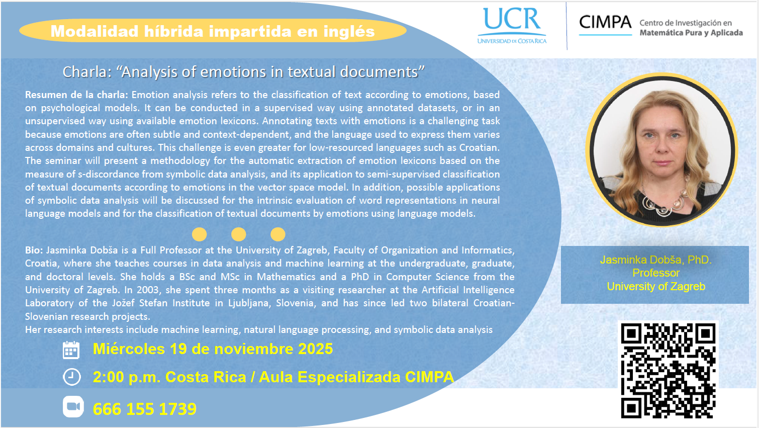 Emotion analysis refers to the classification of text according to emotions, based on psychological models. It can be conducted in a supervised way using annotated datasets, or in an unsupervised way using available emotion lexicons. Annotating texts with emotions is a challenging task because emotions are often subtle and context-dependent, and the language used to express them varies across domains and cultures. This challenge is even greater for low-resourced languages such as Croatian. The seminar will present a methodology for the automatic extraction of emotion lexicons based on the measure of s-discordance from symbolic data analysis, and its application to semi-supervised classification of textual documents according to emotions in the vector space model. In addition, possible applications of symbolic data analysis will be discussed for the intrinsic evaluation of word representations in neural language models and for the classification of textual documents by emotions using language models.
